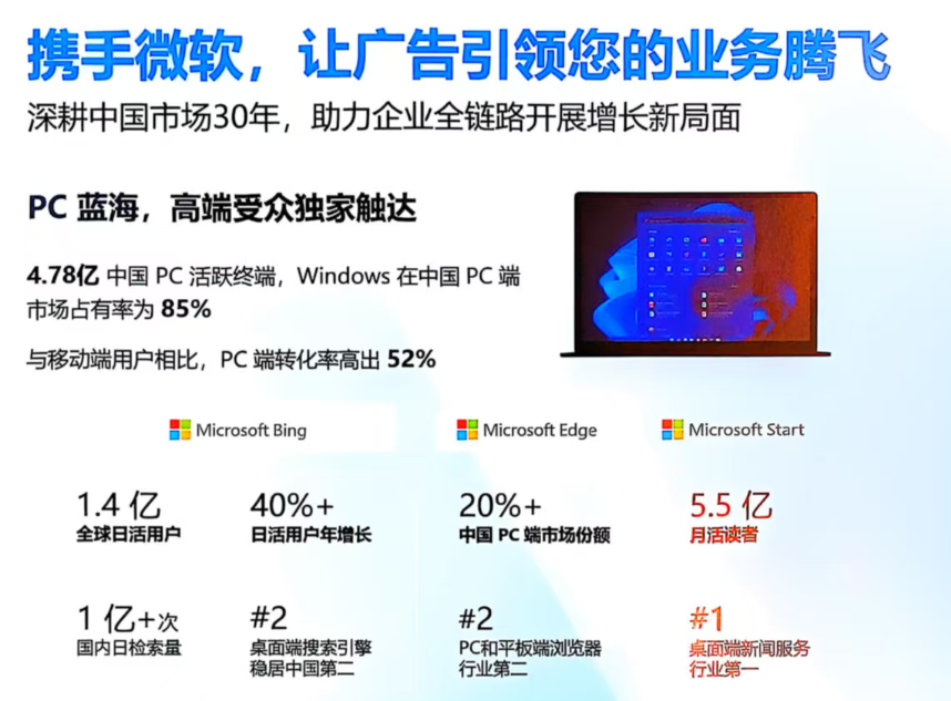 PC蓝海, 高端受众独家触达,微软独占PC端生态优势,引领蓝海流量